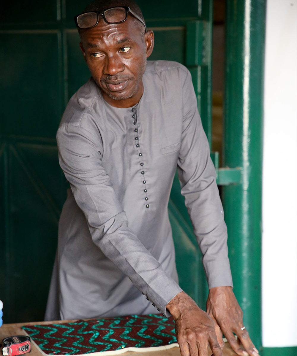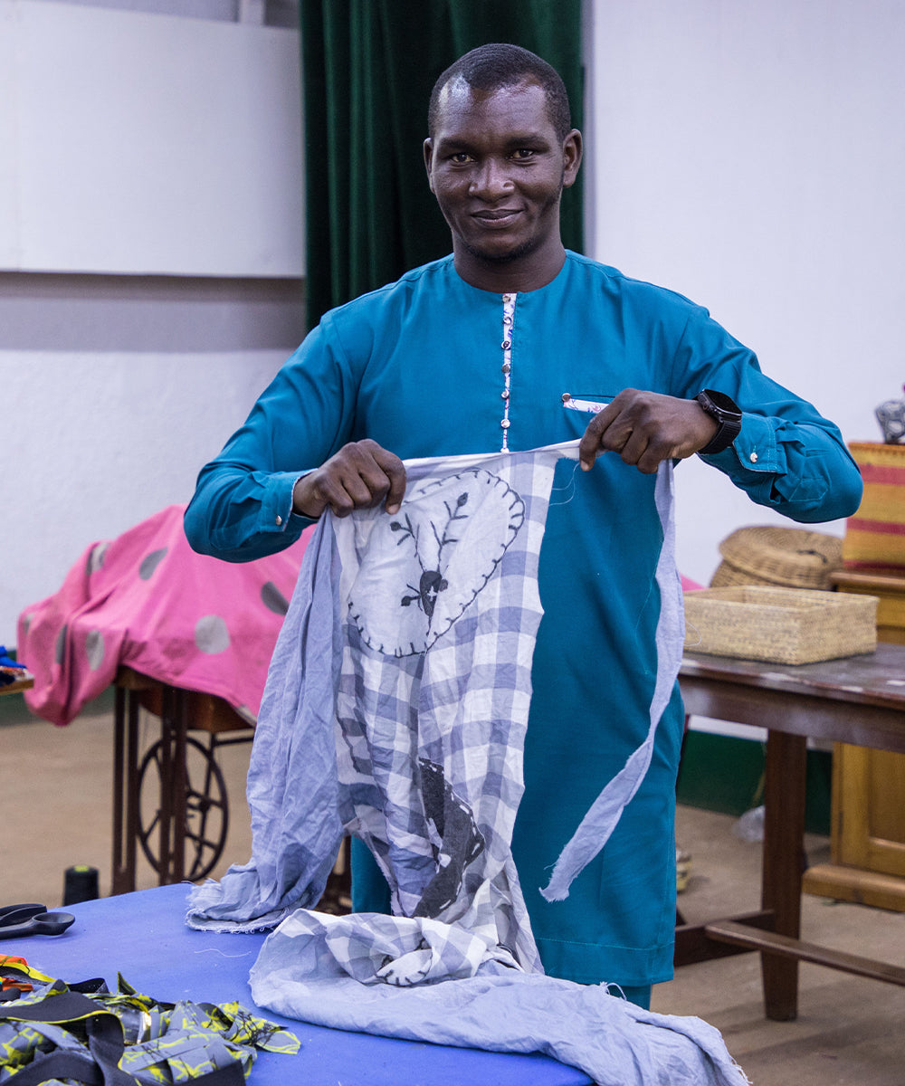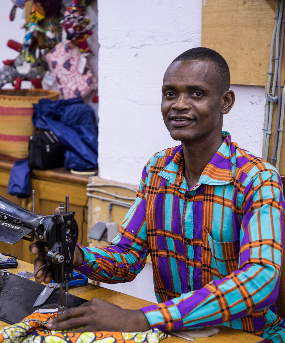 Once a hairdresser, Patrick learned to sew at 20. Recruited to cover a maternity leave, he found more than work — he found purpose. He now supports his family and farms cassava with joy and faith.