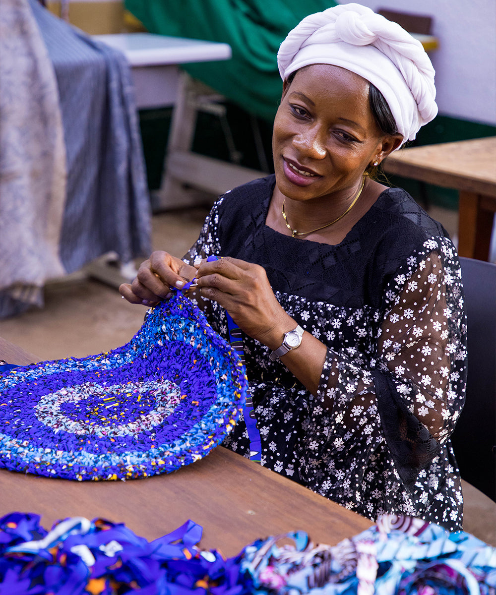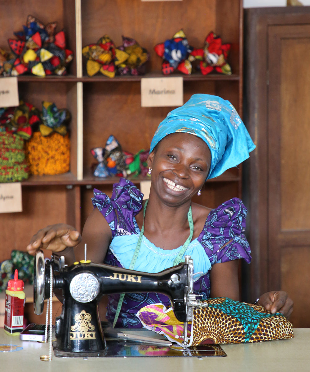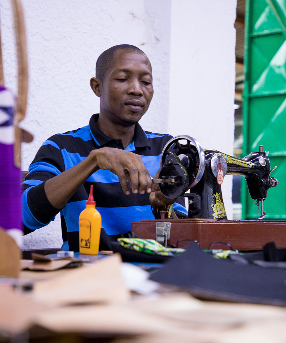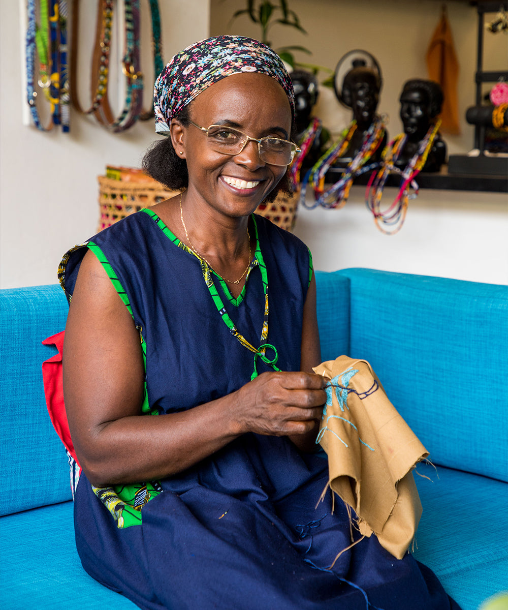 The youngest artisan at Ndara, Pascaline taught herself to sew by copying Ndara products at home. Now a mother of two, she brings energy and focus to every task as she trains and grows.