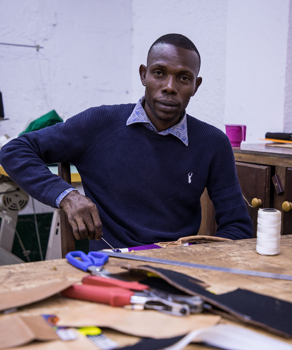 Juste began sewing at 14, eventually funding his own training in leatherwork. A father of five, he joined Ndara to grow and now crafts high-quality goods with purpose and pride.