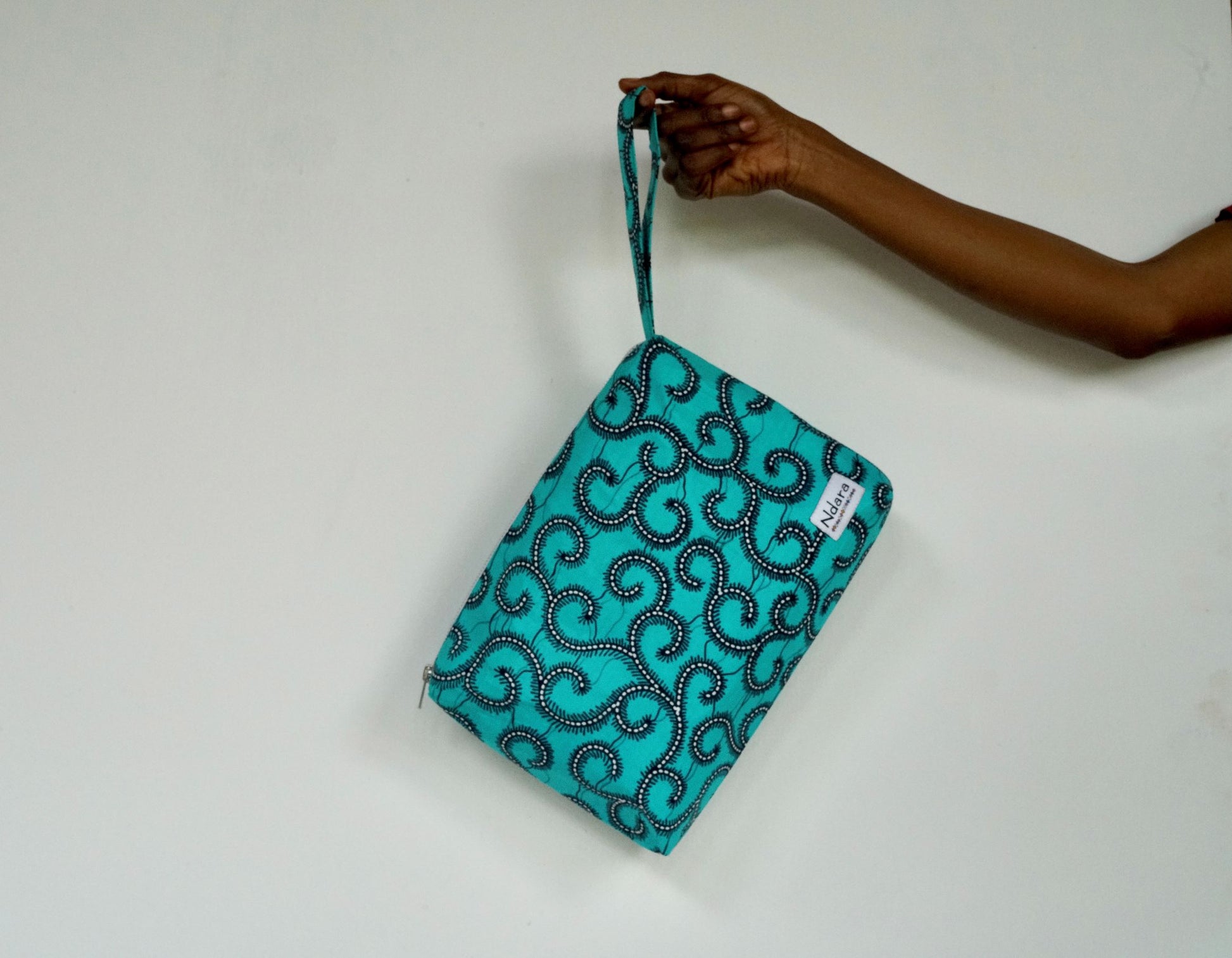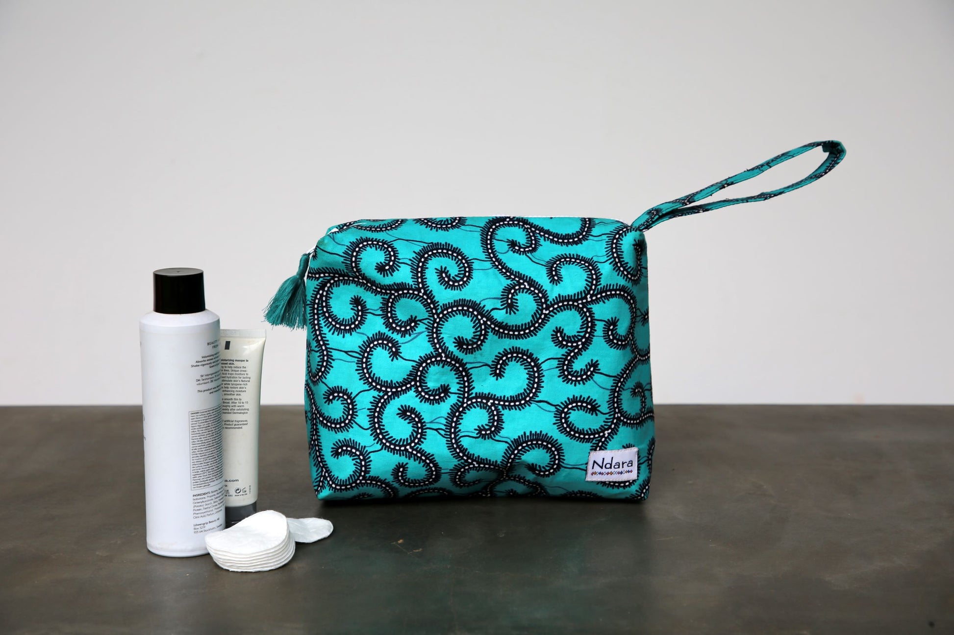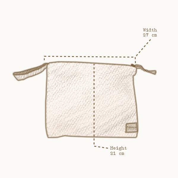 This bag-pouch-toilet bag is made from leftover fabric from our workshop, is lightweight, and water-resistant (due to starched fabric in the filling). Limited edition.