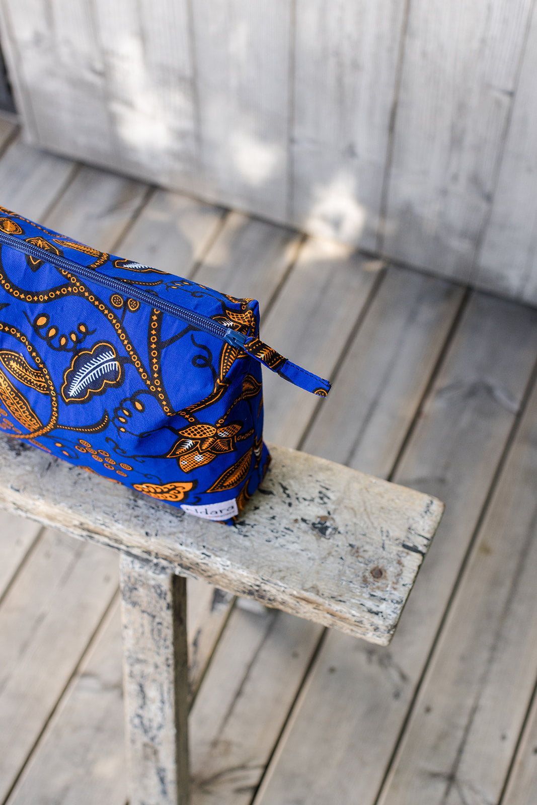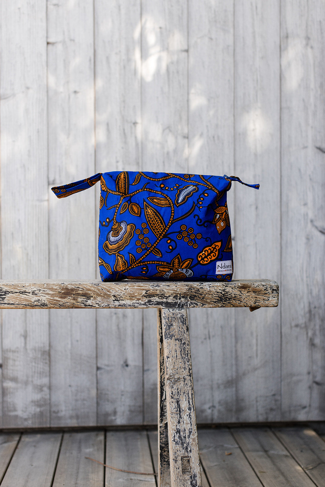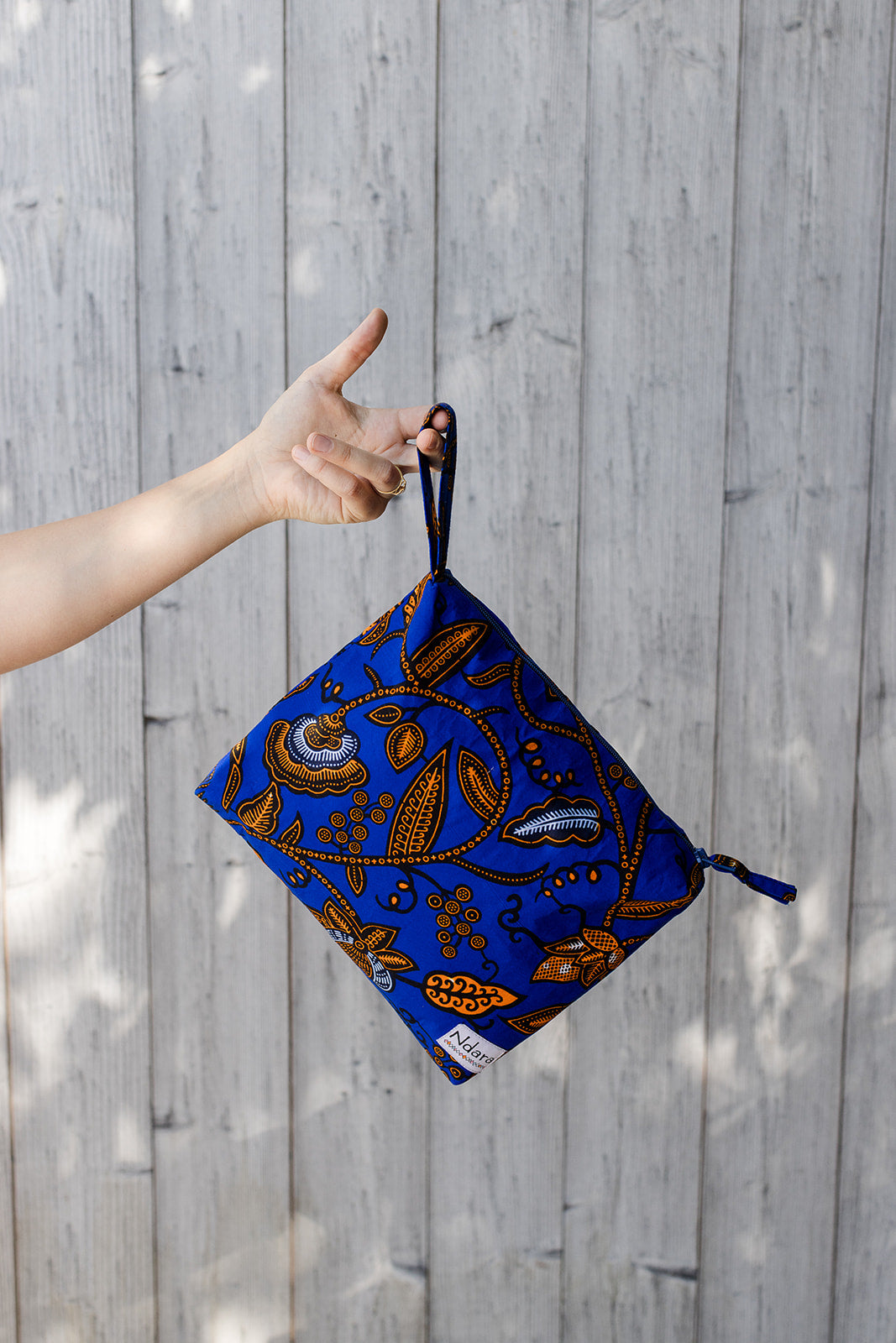 This lightweight and versatile rectangular pouch is handmade from vibrant wax print fabric. It features a sturdy structure thanks to a layer of starched cotton and a soft, unstarched cotton lining inside. Perfect for organizing small essentials — from cosmetics to electronics — while adding a splash of color, craft, and impact to your everyday carry.
