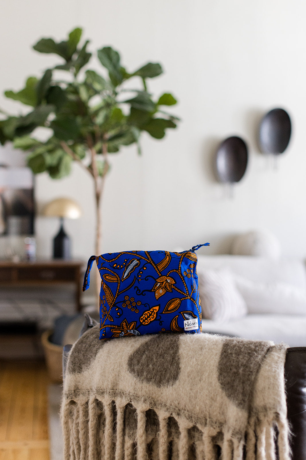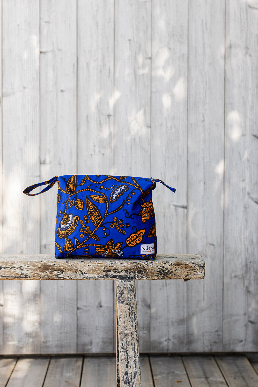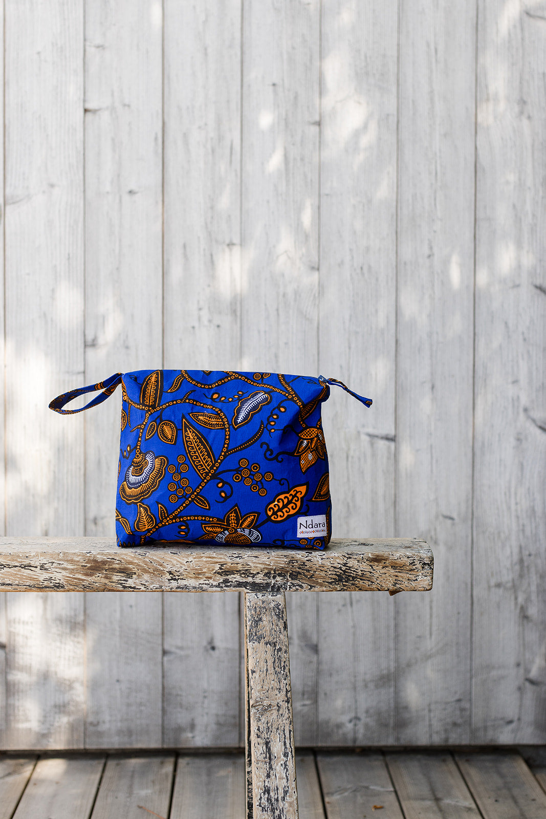 This lightweight and versatile rectangular pouch is handmade from vibrant wax print fabric. It features a sturdy structure thanks to a layer of starched cotton and a soft, unstarched cotton lining inside. Perfect for organizing small essentials — from cosmetics to electronics — while adding a splash of color, craft, and impact to your everyday carry.