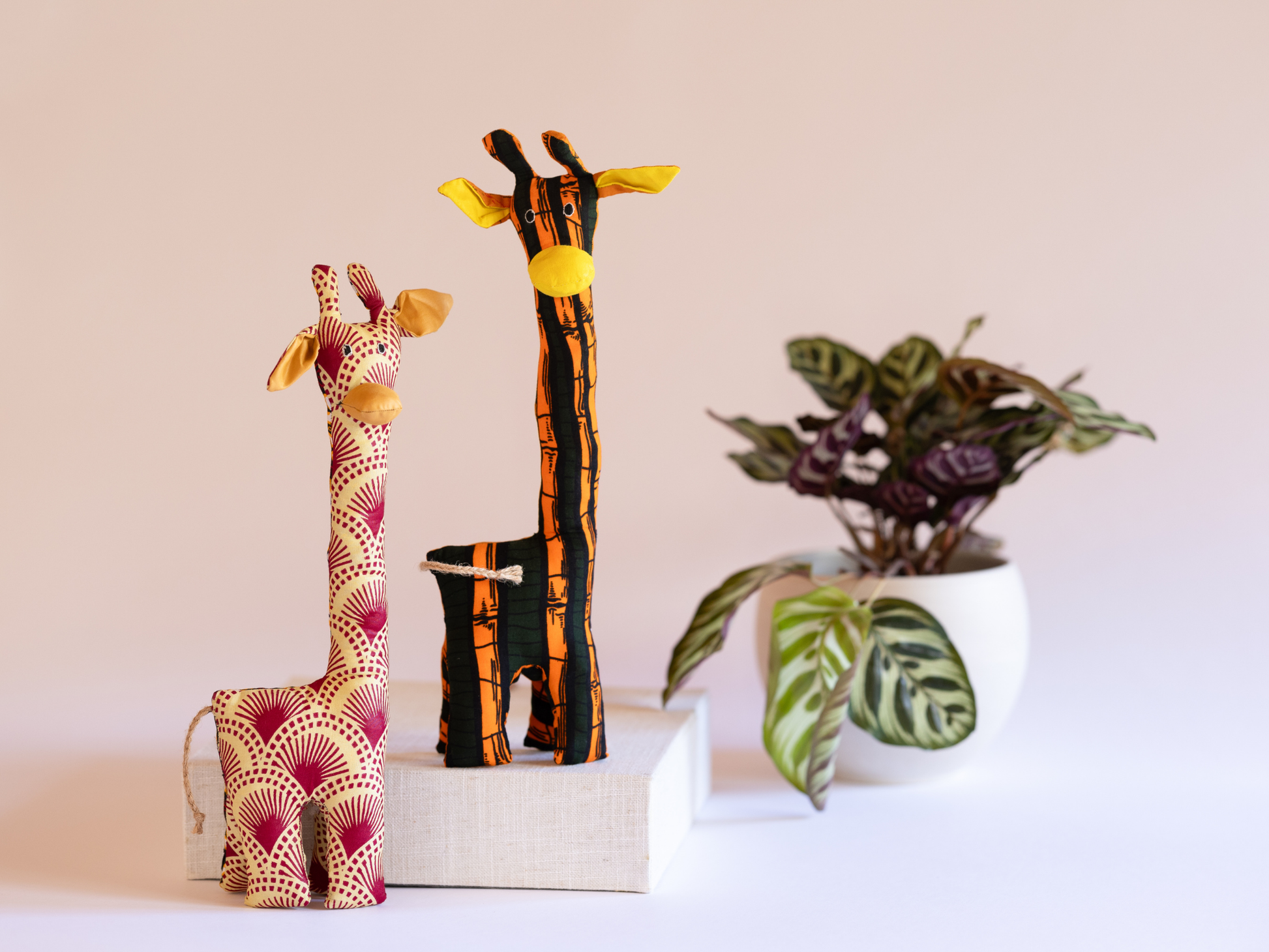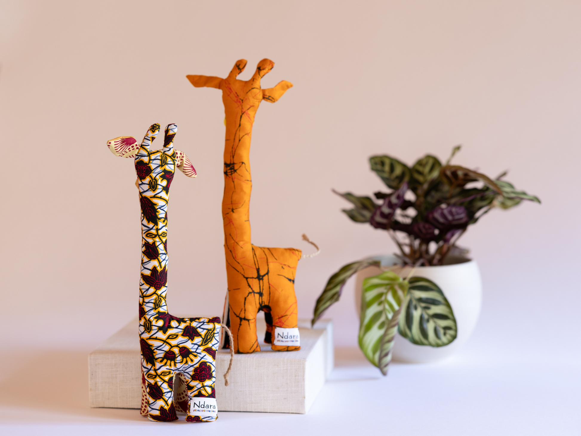 Each giraffe is hand-sewn from recycled cotton wax fabric and stuffed with soft, recycled foam, making it both eco-conscious and uniquely beautiful. No two are alike — every giraffe features a different mix of colors and patterns on each side.