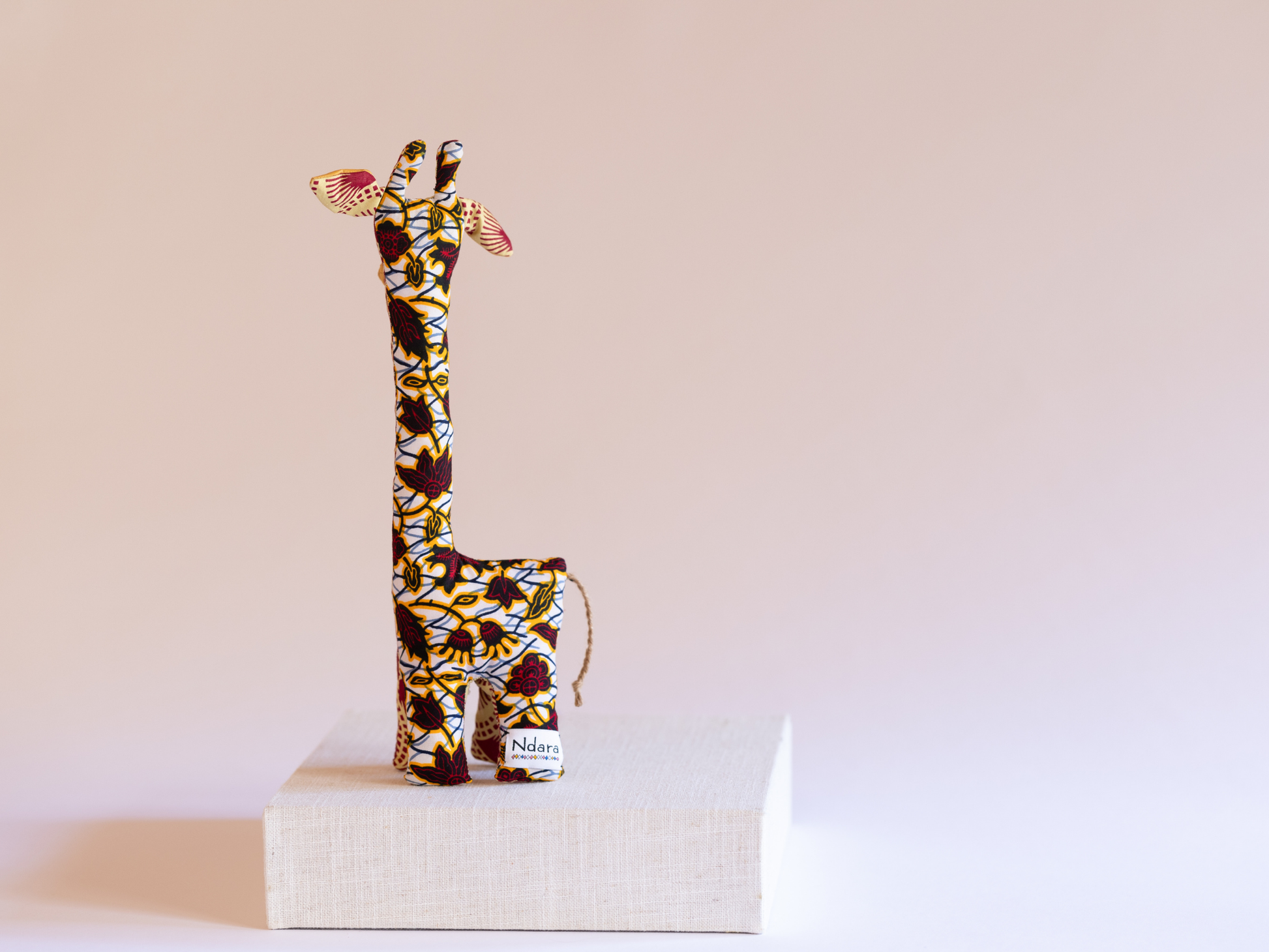 Giraffes in the Central African Republic are found only in the remote north — a vast, sparsely populated landscape of protected areas, where wildlife faces increasing threats from poaching due to limited state presence. This handmade giraffe plush is a small tribute to these majestic animals and the environment they inhabit.