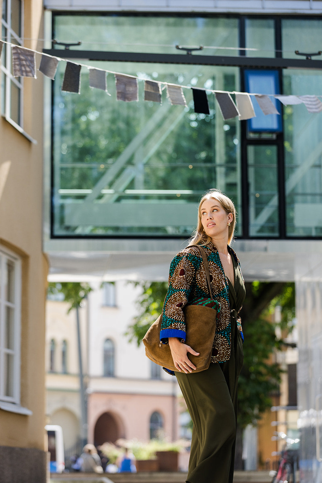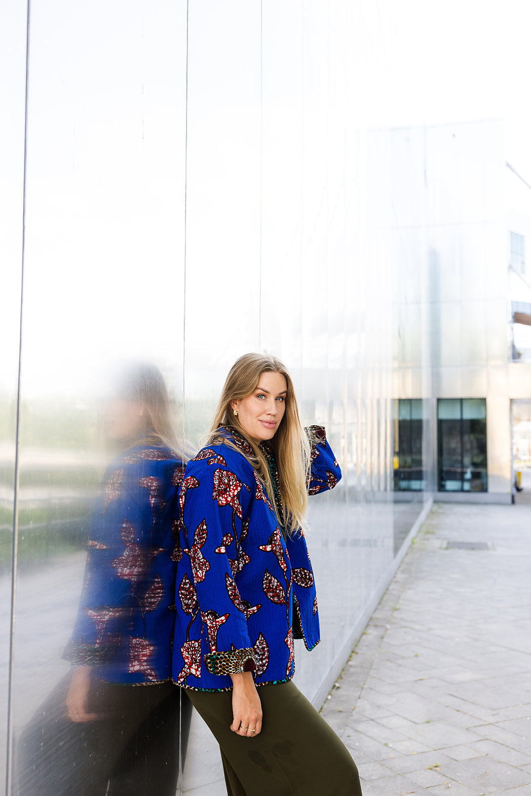 Our Reversible Wax Print Jacket is designed with a generous cut for layering and comfort. Choose your size based on how you like to wear your jackets — more fitted or more relaxed. A versatile statement piece with an elegant silhouette and relaxed fit. Fully reversible, each side reveals a bold wax print for two standout looks in one. With practical pockets and thoughtful tailoring, it layers effortlessly — light for summer evenings, warm under winter coats. Its classic cut and quality craftsmanship mean it’s made to last, while the vibrant Cacao Hibiscus fabric keeps it anything but ordinary. Handmade by Omega — one of Ndara’s skilled artisans.