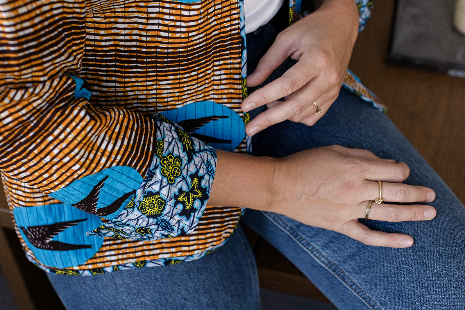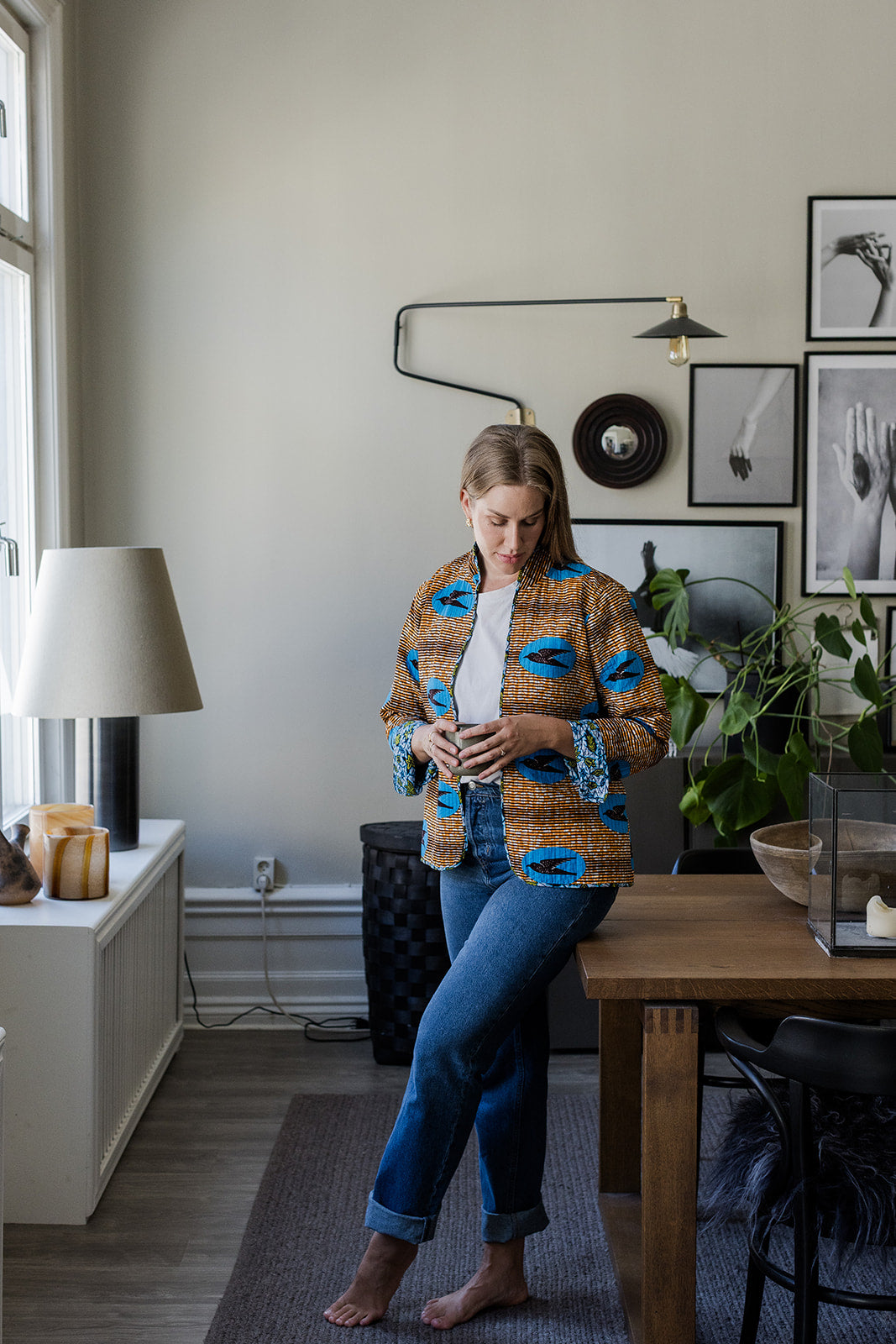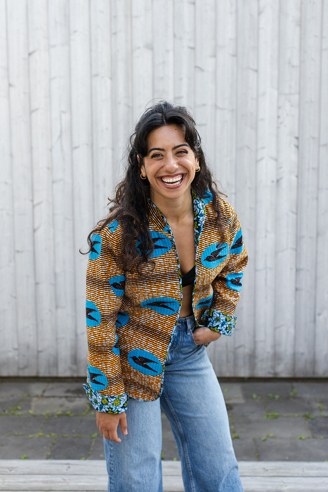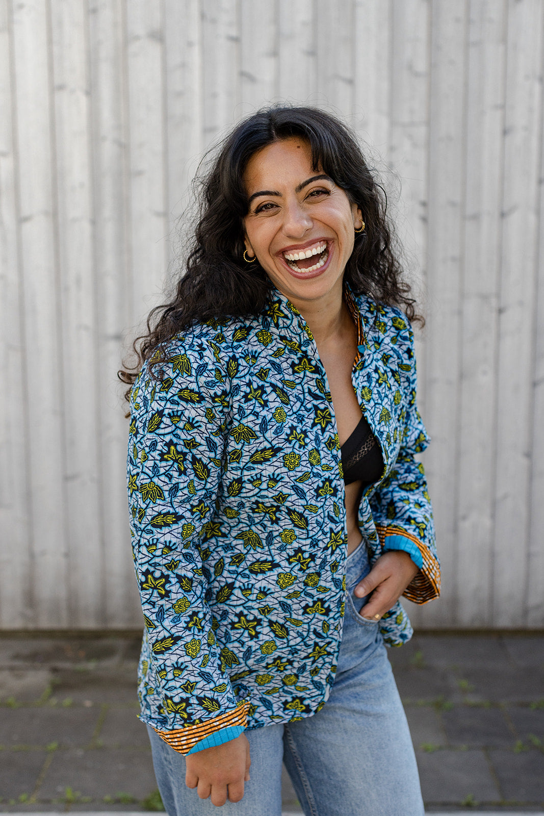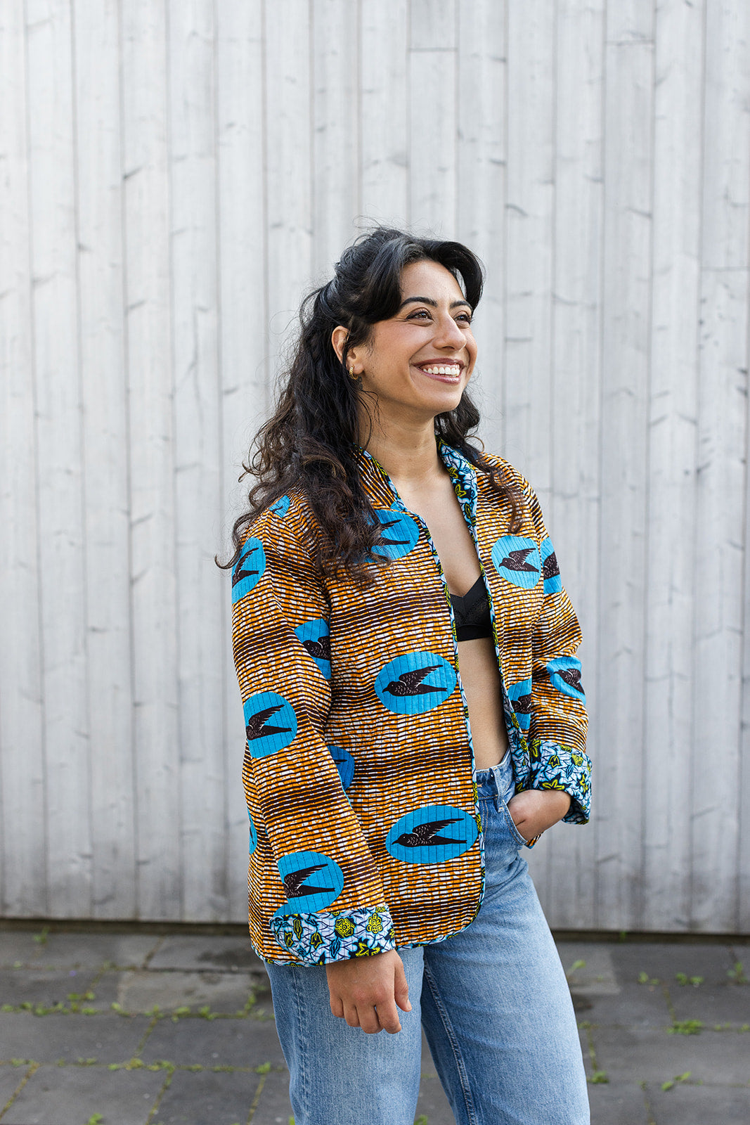 Our Reversible Wax Print Jacket is designed with a generous cut for layering and comfort. Choose your fit based on how you like to wear your jackets — more fitted or more relaxed. A versatile statement piece with an elegant silhouette and relaxed fit. Fully reversible, each side reveals a bold wax print for two standout looks in one. With practical pockets and thoughtful tailoring, it layers effortlessly — light for summer evenings, warm under winter coats. Its classic cut and quality craftsmanship mean it’s made to last, while the vibrant Tangerine Swallows fabric keeps it anything but ordinary. Handmade by Omega — one of Ndara’s skilled artisans.