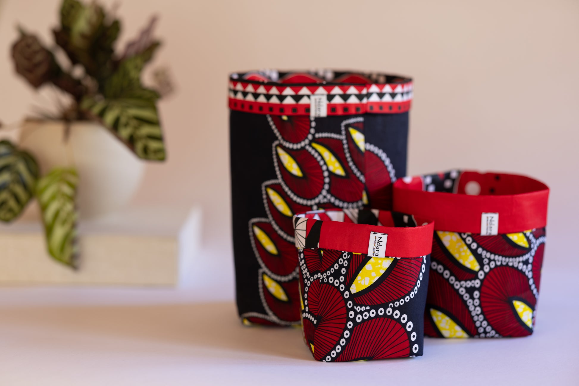 Super lightweight, set of three baskets, perfect for storing all your little stuff in or for displaying your favorite plant. Limited edition. Interior and exterior fabrics are different. Width of folded edge is adjustable.