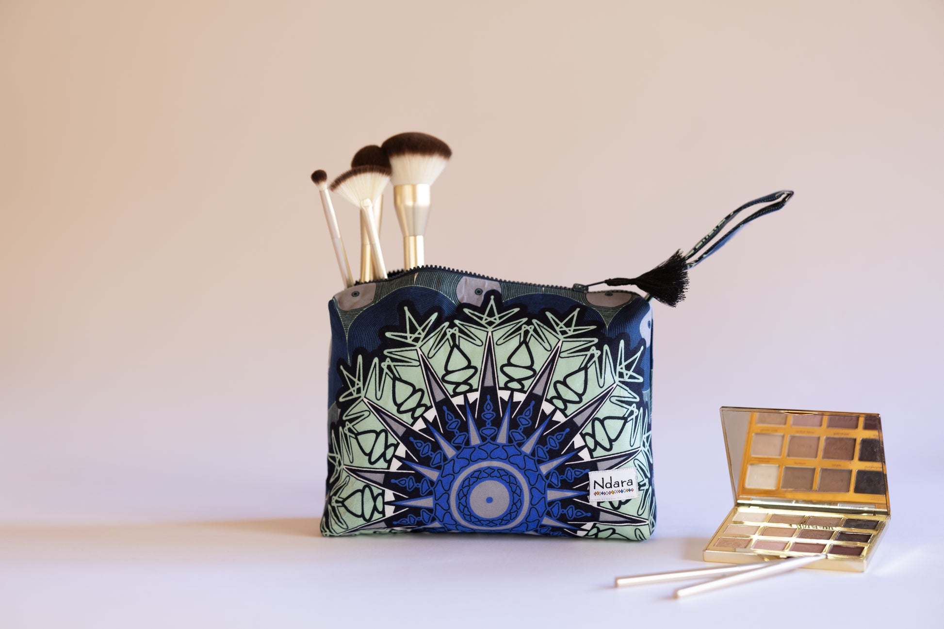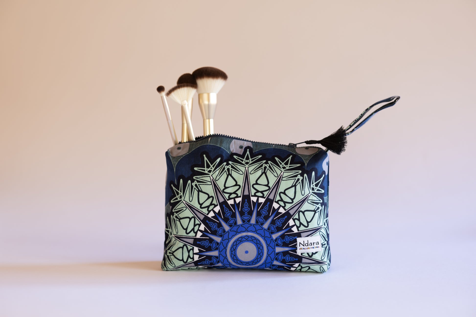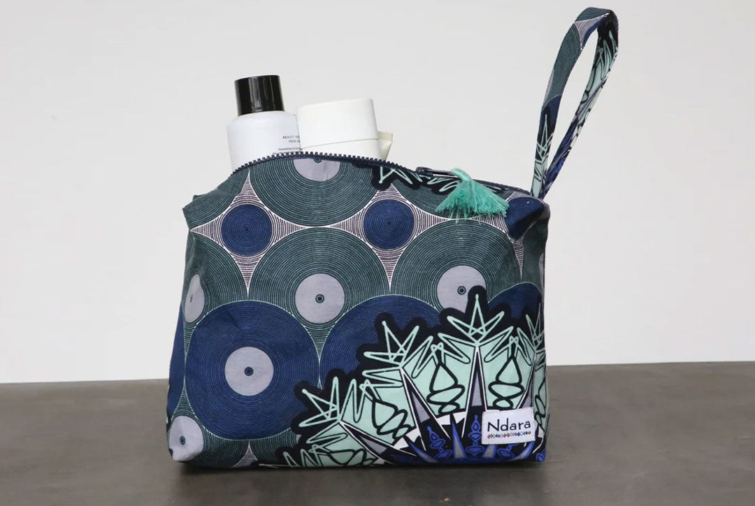 This bag-pouch-toilet bag is made from leftover fabric from our workshop, is lightweight, and water-resistant (due to starched fabric in the filling). Limited edition.