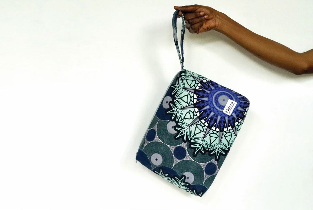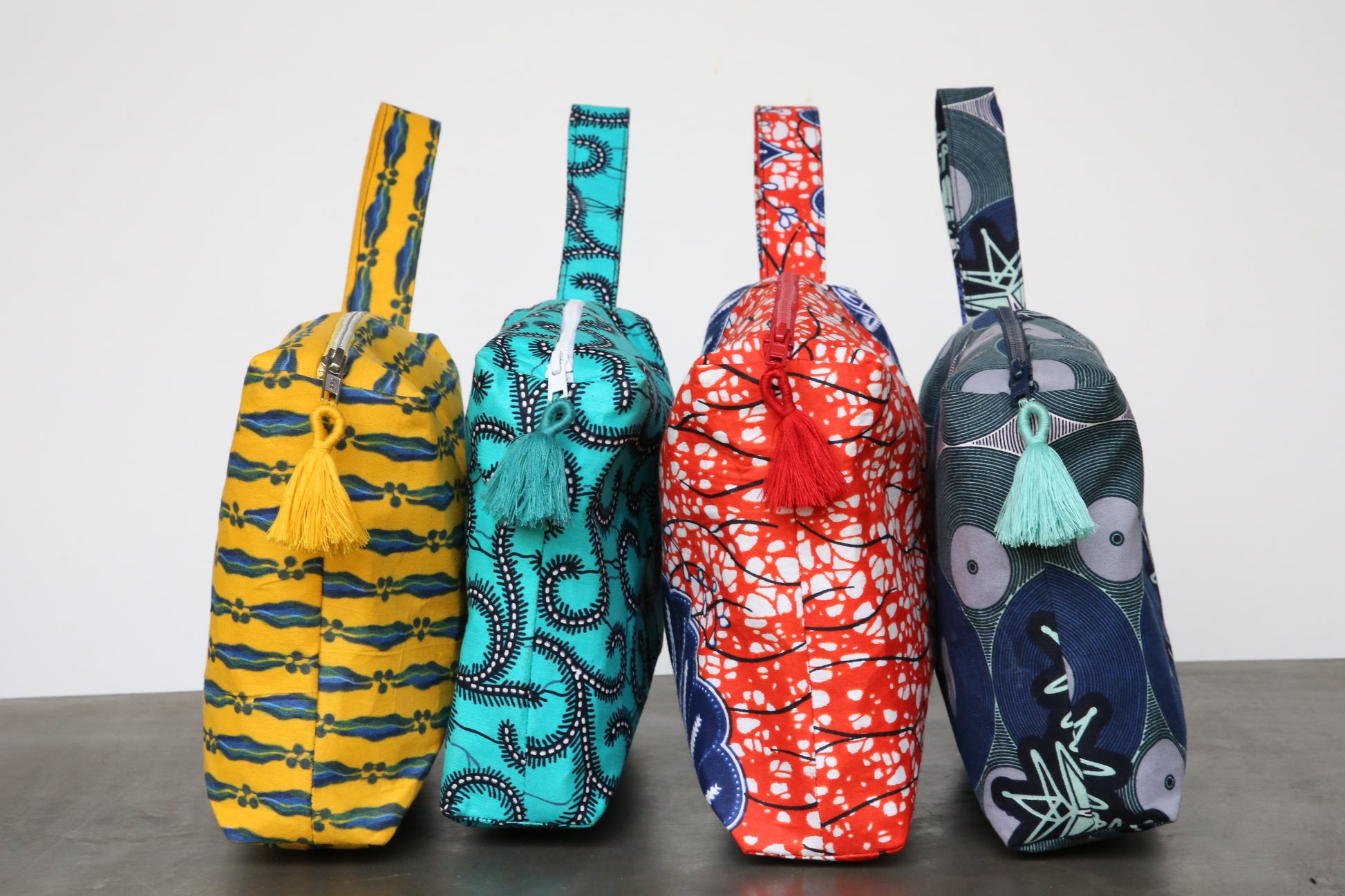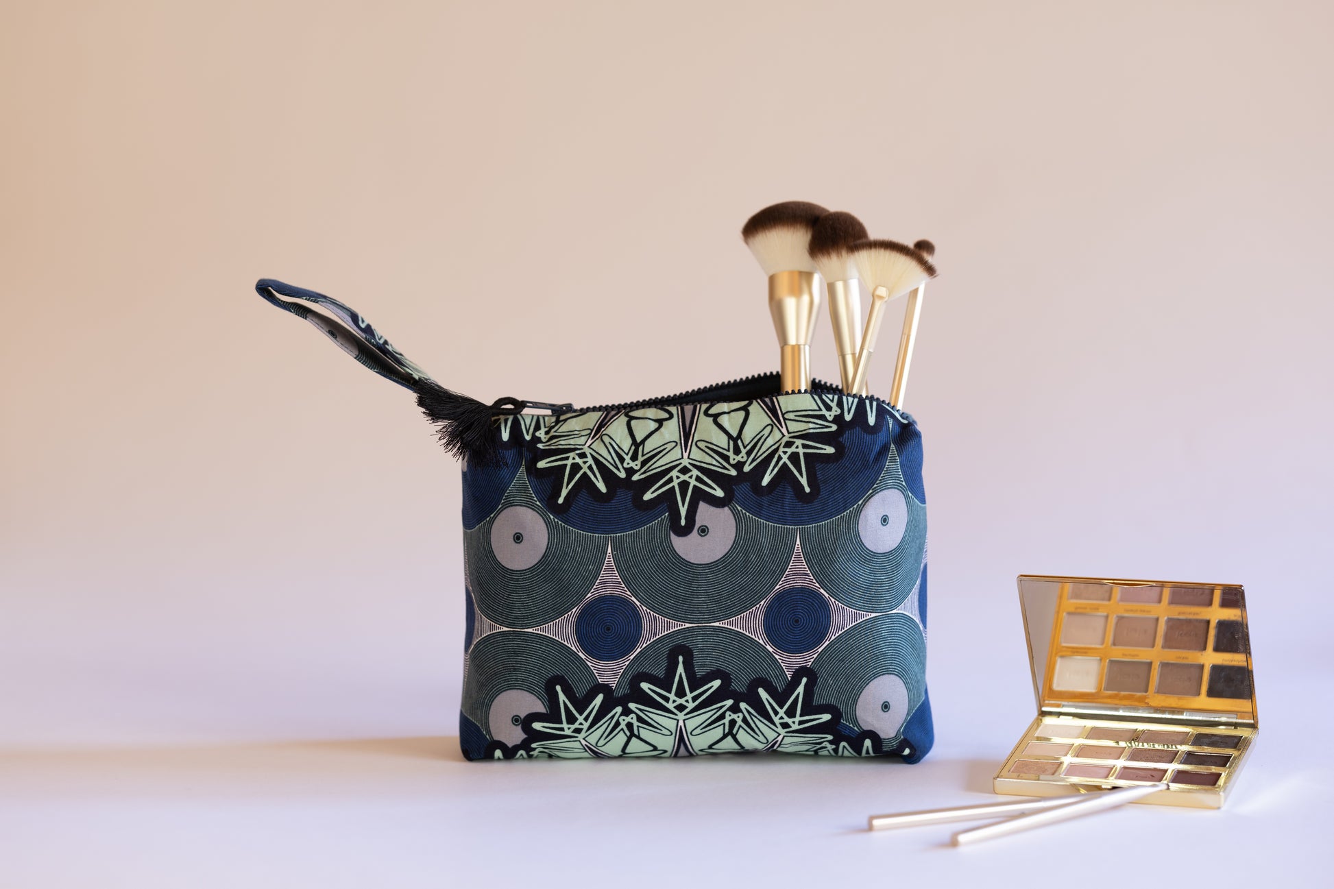 This bag-pouch-toilet bag is made from leftover fabric from our workshop, is lightweight, and water-resistant (due to starched fabric in the filling). Limited edition.
