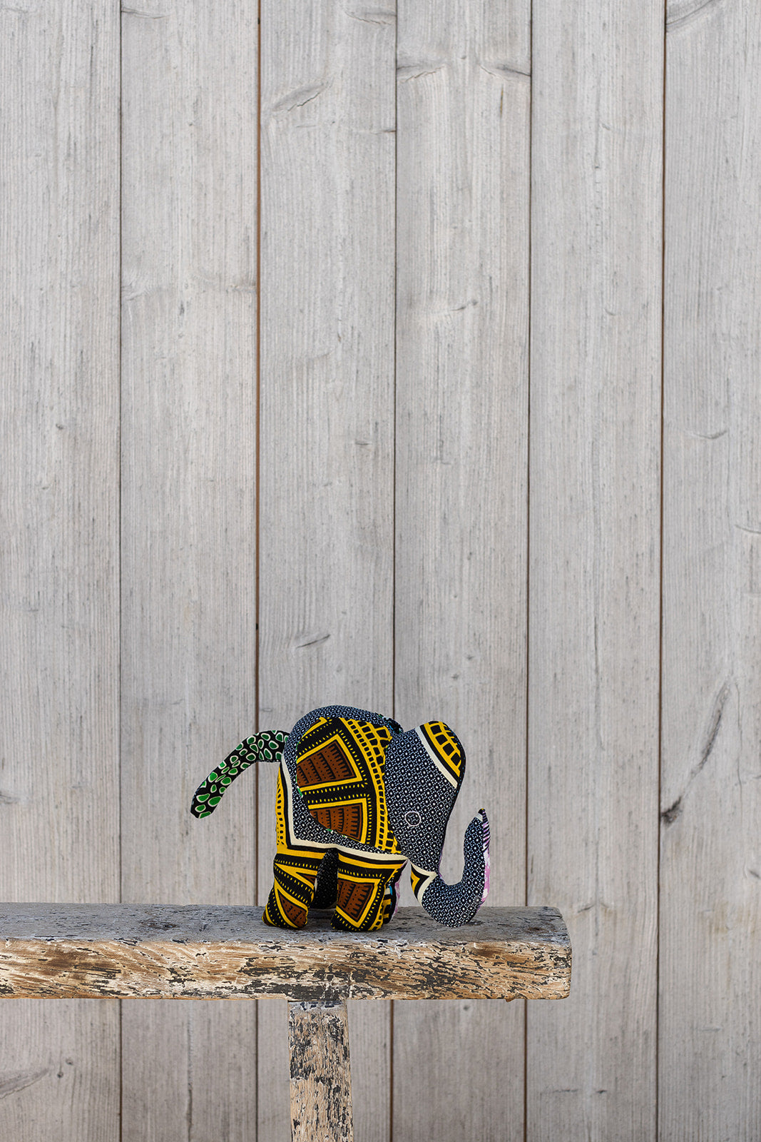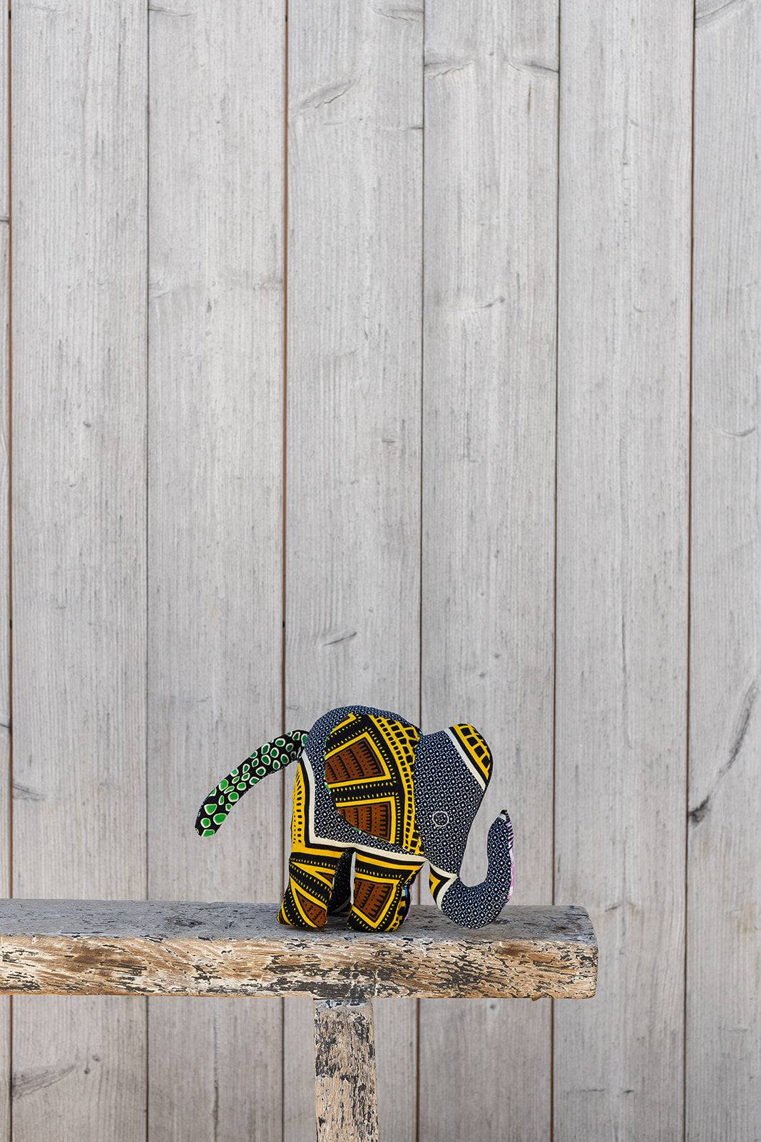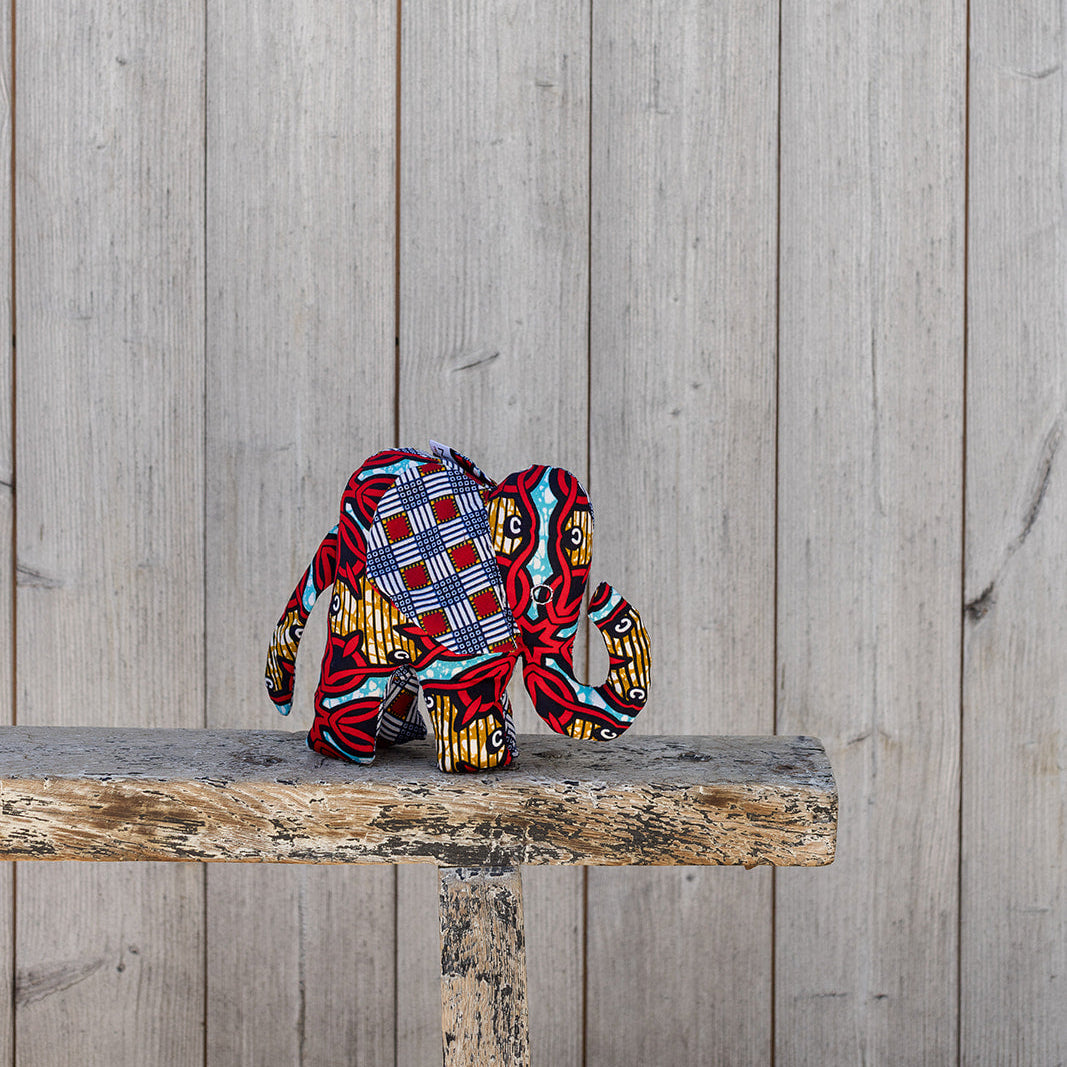 This soft elephant toy is hand-sewn from recycled cotton wax fabric and filled with recycled foam, making it both eco-friendly and unique. Each one features a distinct mix of colors and patterns, so no two are the same.