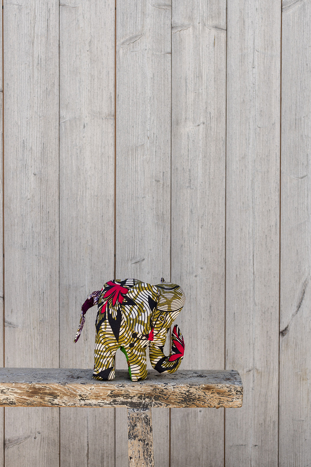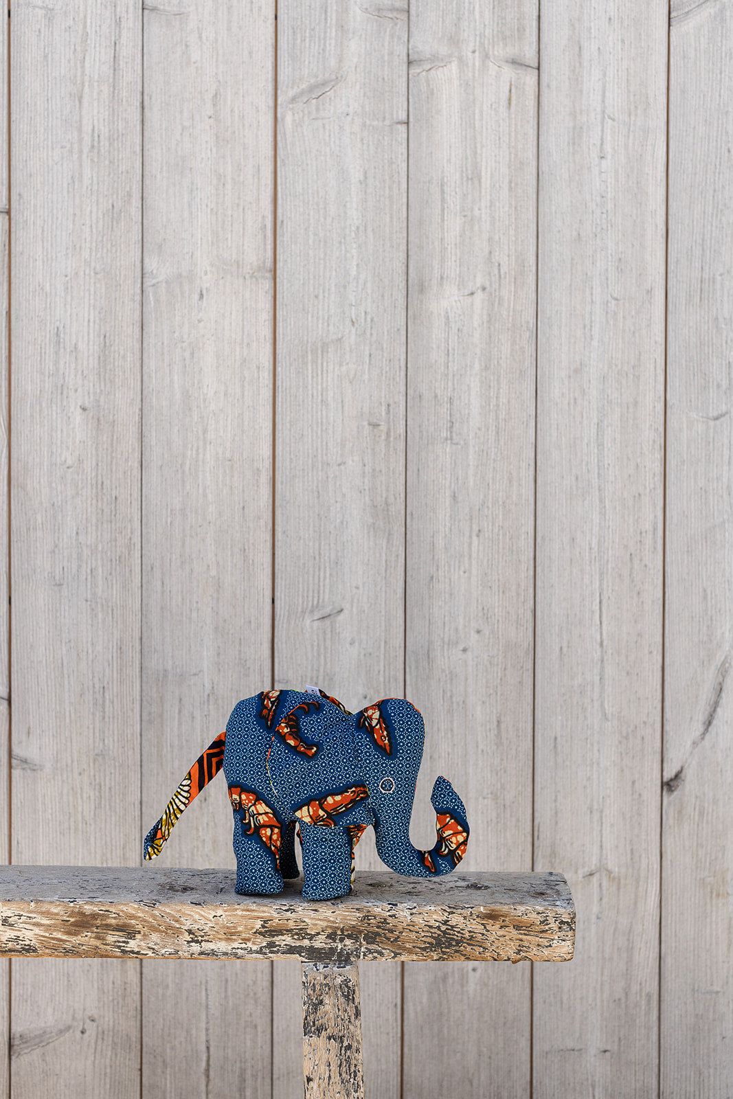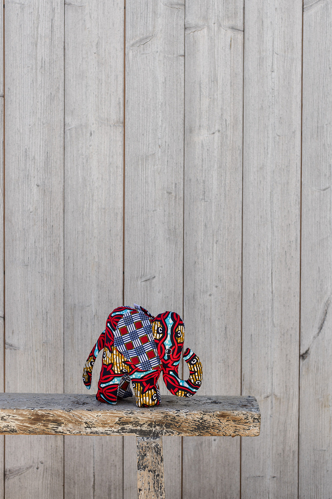 This soft elephant toy is hand-sewn from recycled cotton wax fabric and filled with recycled foam, making it both eco-friendly and unique. Each one features a distinct mix of colors and patterns, so no two are the same.