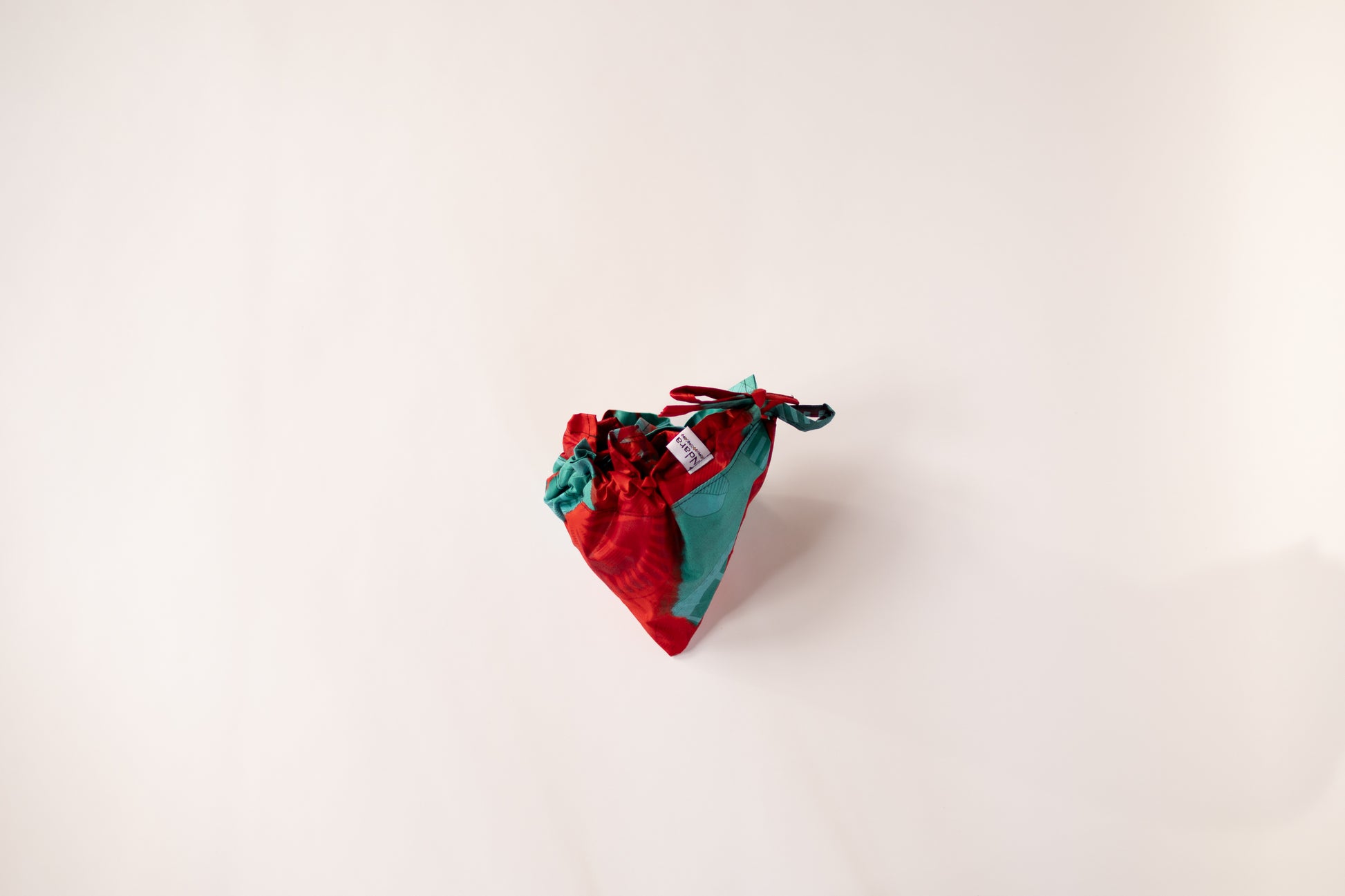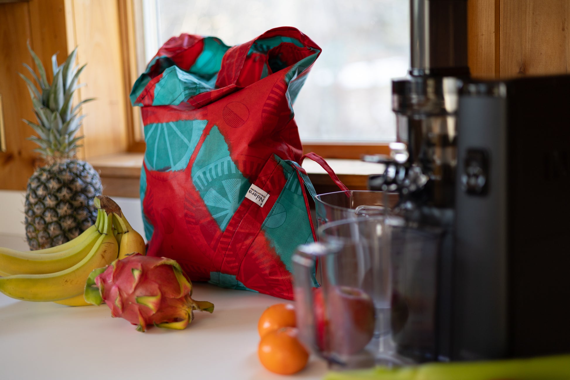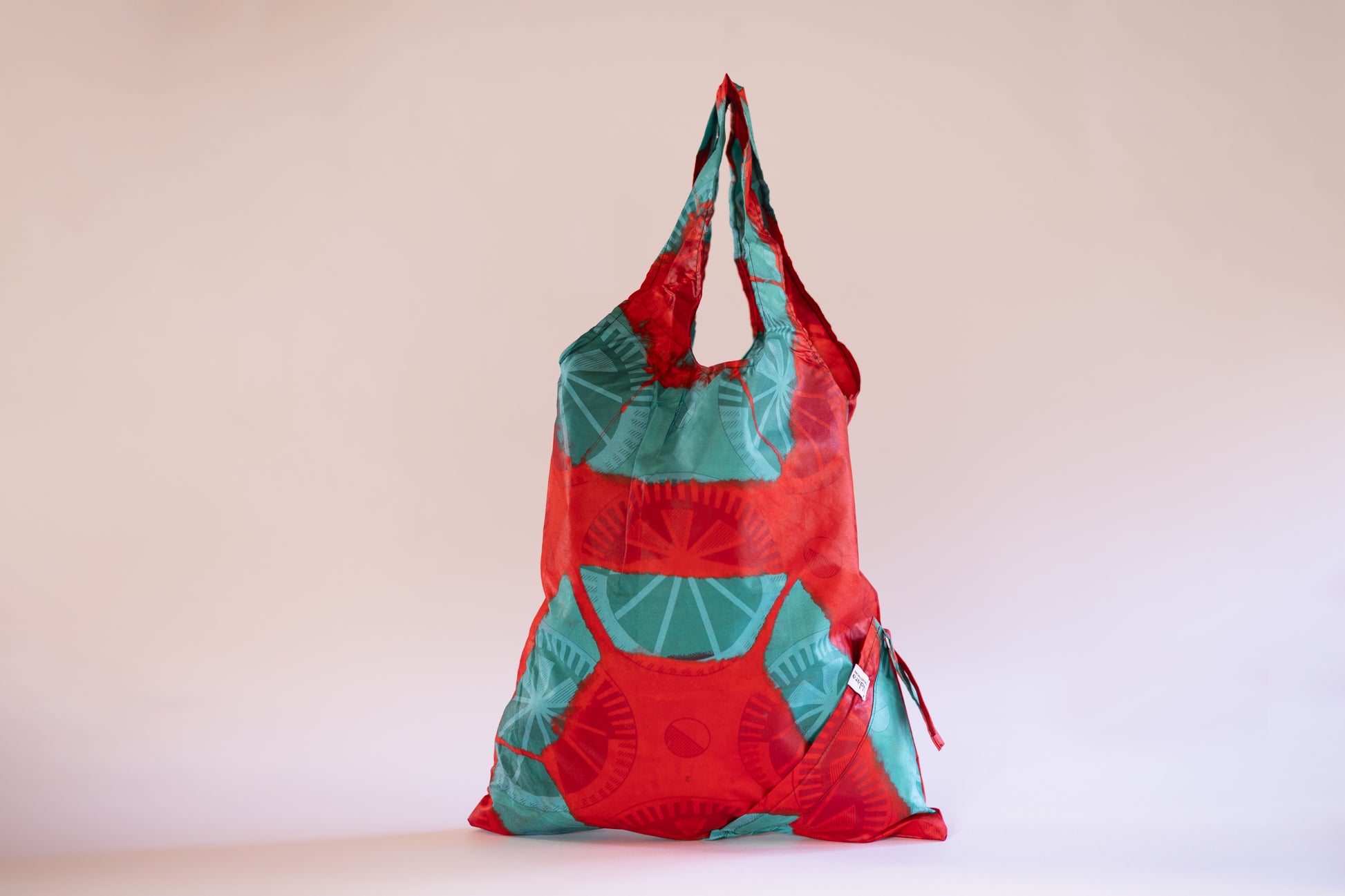 A foldable, reusable shopping bag that folds into a storage pouch attached to the corner of the bag. Limited edition.