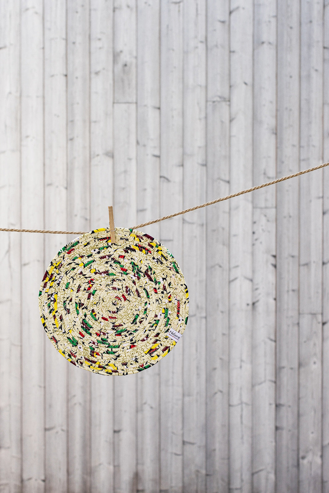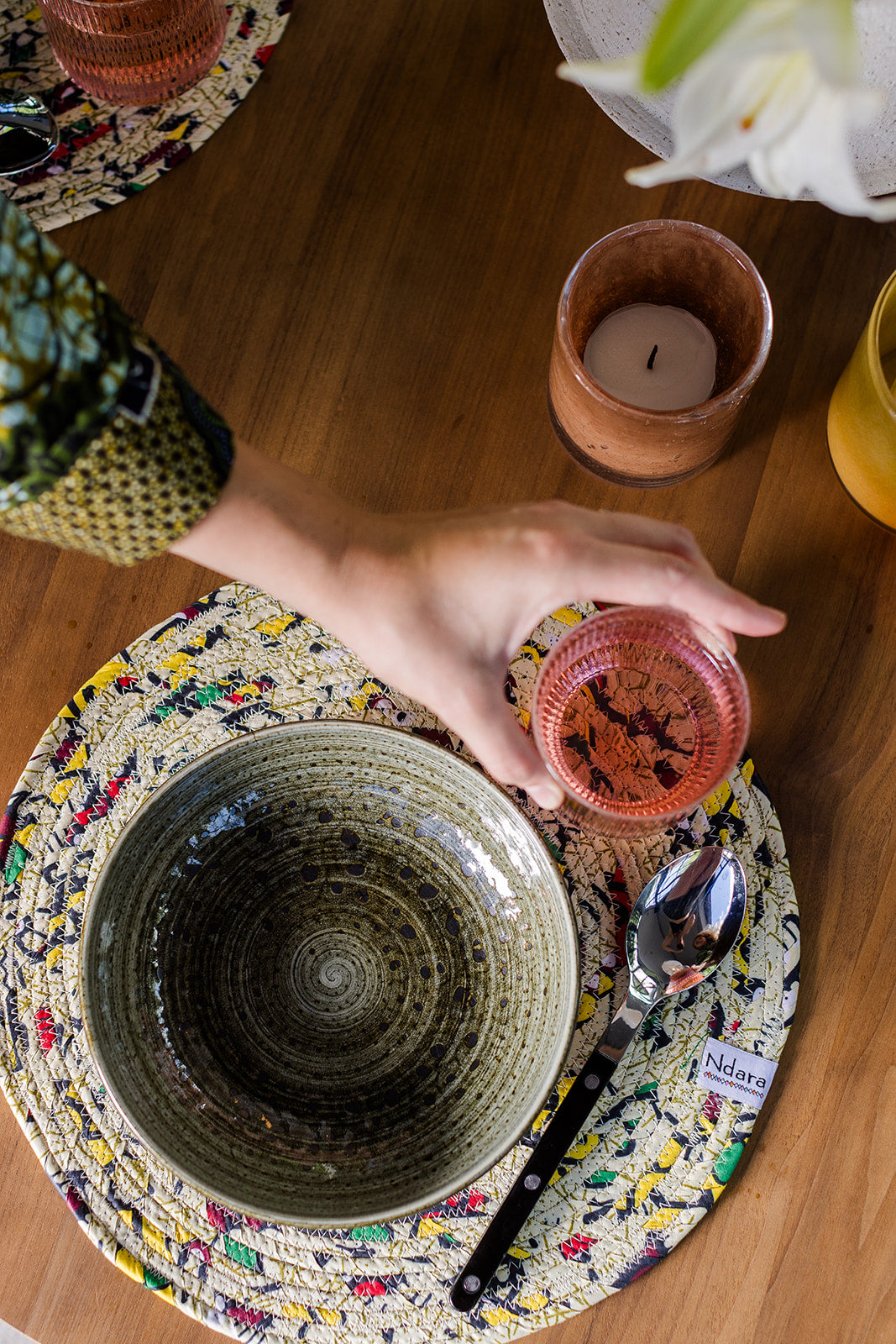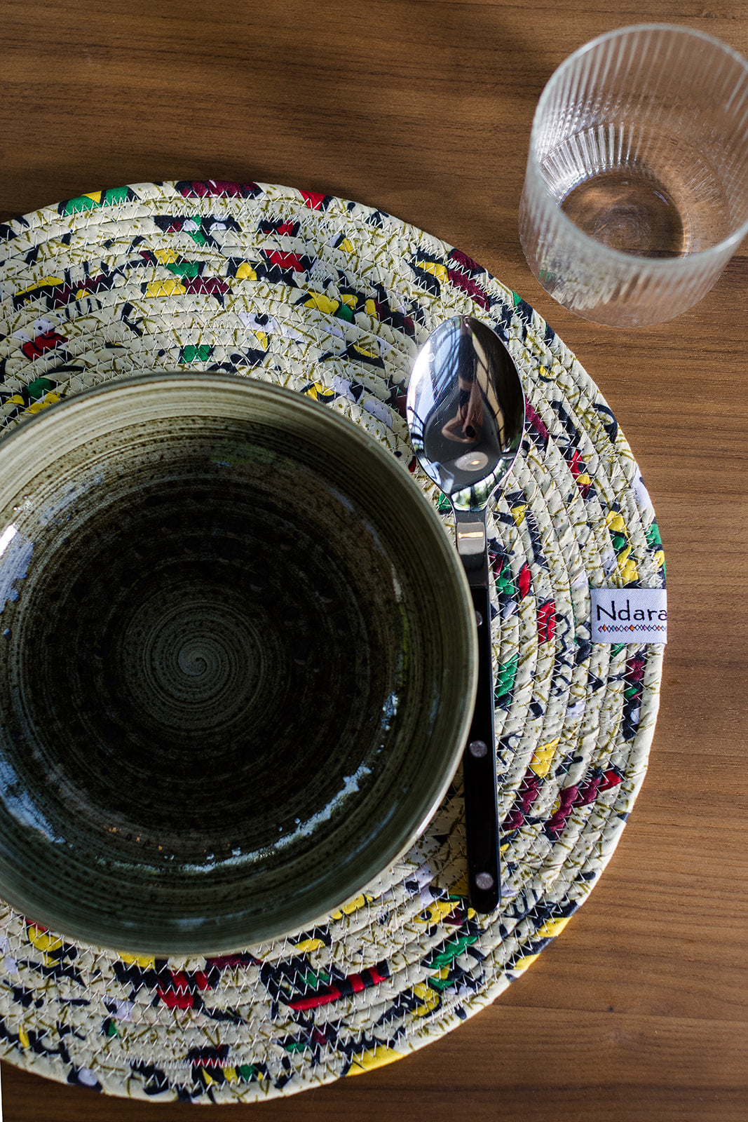Crafted by hand from twisted strands of wax print fabric. These round placemats are stitched together using a tight zigzag technique that creates a sturdy, durable surface. Bold in color and texture, they bring a unique flair to any table setting.