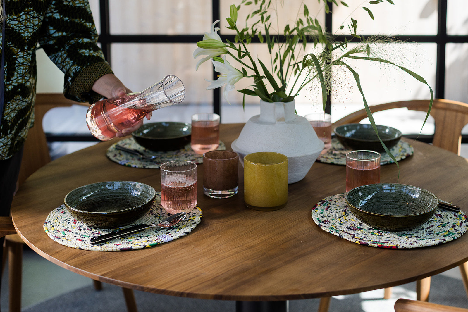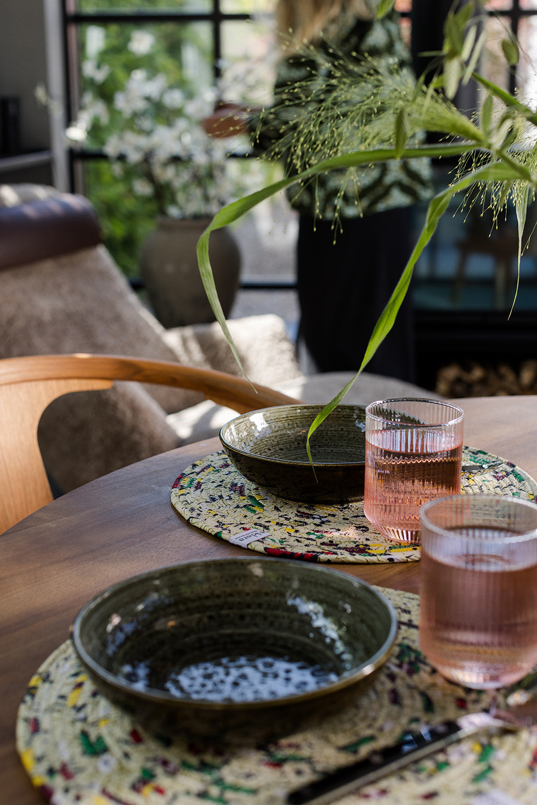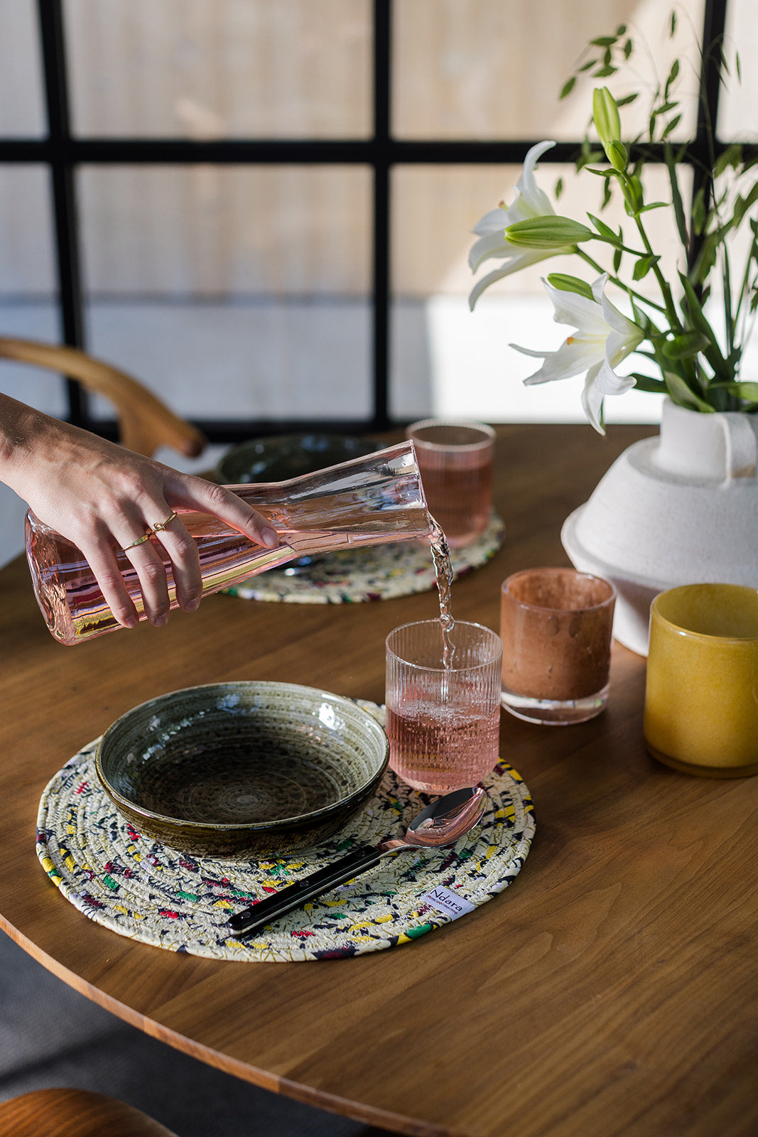 Crafted by hand from twisted strands of wax print fabric. These round placemats are stitched together using a tight zigzag technique that creates a sturdy, durable surface. Bold in color and texture, they bring a unique flair to any table setting.