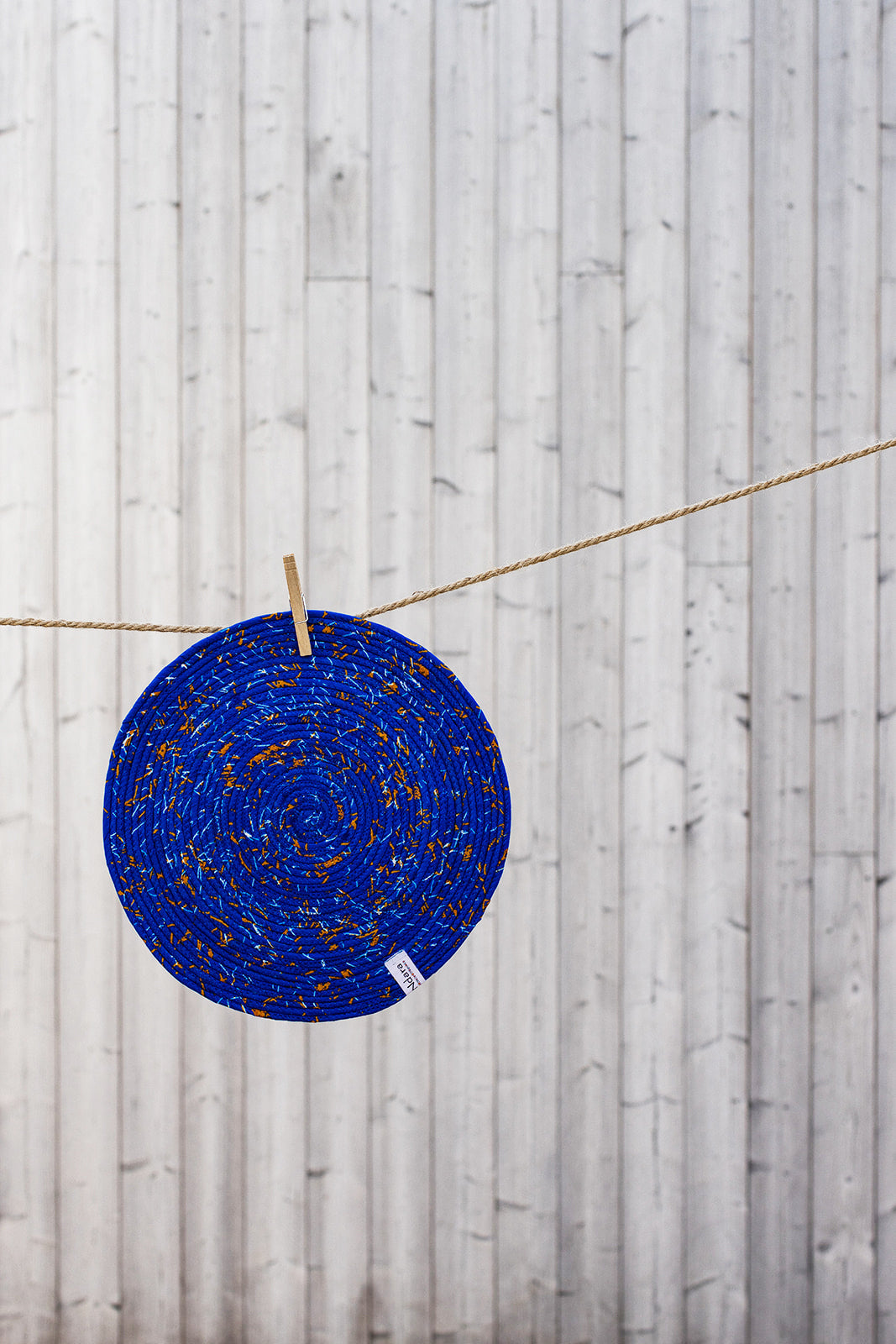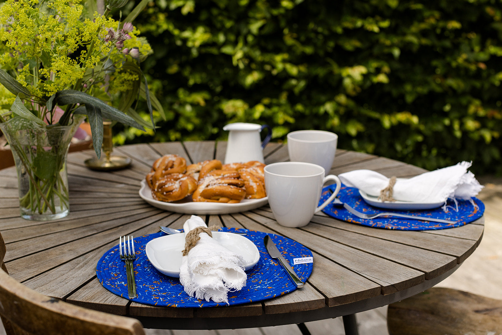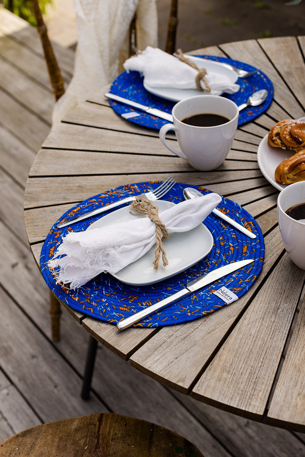 Crafted by hand from twisted strands of wax print fabric. These round placemats are stitched together using a tight zigzag technique that creates a sturdy, durable surface. Bold in color and texture, they bring a unique flair to any table setting.